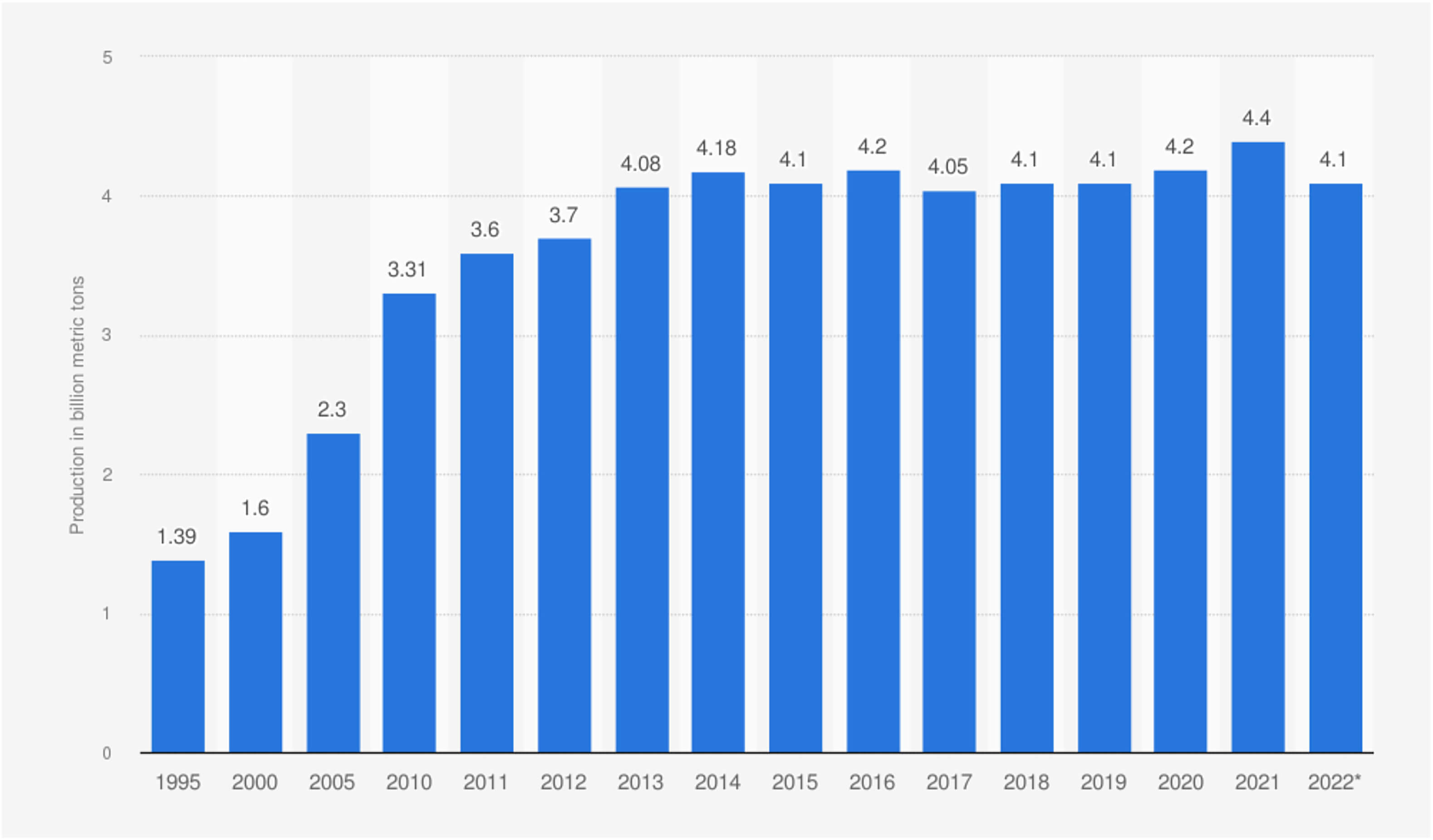 Desde o século XIX, a produção de cimento tem crescido constantemente, acompanhando a urbanização e o aumento populacional. Em 2021, foram produzidos globalmente cerca de 4,4 bilhões de toneladas desse material, com previsões indicando um crescimento contínuo até 2050. O processo de fabricação libera CO2 em duas etapas principais: