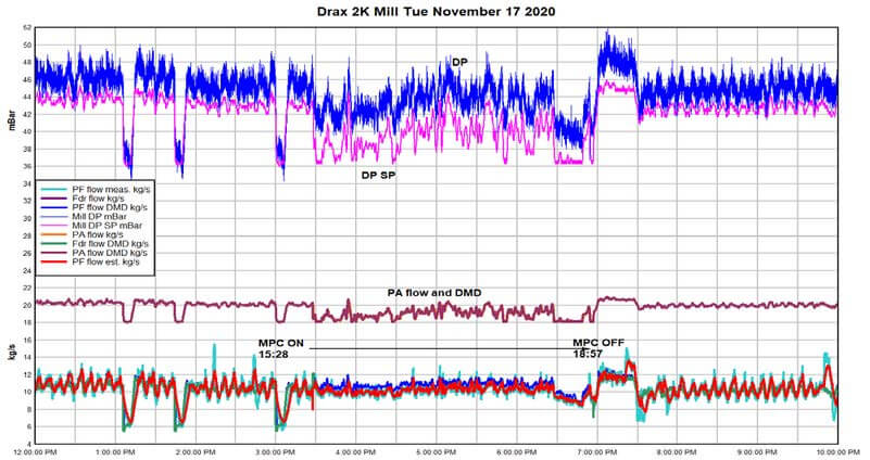 O controlador MPC também foi integrado em vários moinhos na caldeira de biomassa de 660MW. Aqui, o modelo inclui as medições de fluxos de massa e a pressão diferencial sobre o moinho para calcular, além da demanda de ar e carvão, também a quantidade de pf dentro do moinho, como o nível de enchimento de grãos não moídos e pf em suspensão a ar.