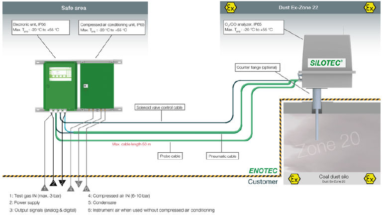 Projetado para monitoramento contínuo em silos de carvão e outros contendo perigos de poeira potencialmente combustível, SILOTEC 8000 atende ATEX Zona 20, requisitos e ofertas de longo prazo de funcionamento sem nenhuma manutenção.