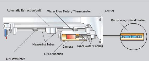 O sistema de retração automática do sensor opera com ar comprimido para inserir a câmera no forno e retraí-la imediatamente em caso de falhas (Fig. 4). Para monitorar as condições da água de resfriamento e o fornecimento de ar comprimido, o sistema é monitora ambas as variáveis continuamente.