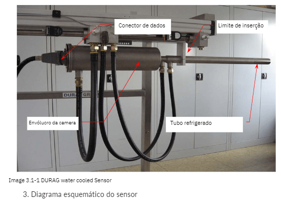O Sensor de imagem da DURAG foi projetado para uso em processos de alta temperatura e ambientes empoeirados. A caixa do sensor é resfriado a água ou a ar comprimido e uma ponta do sensor selada a ar comprimido (Fig. 2). O sensor é composto por um boroscópio como sistema óptico, uma câmera CCD colorida e para o sistema de espectroscopia todos os componentes ópticos e de fibra ótico necessários para captar a radiação eletromagnética do processo e para transportar esta radiação até o espectrômetro localizado no painel de campo (Fig. 3). O boroscópio está, portanto, equipado com duas fibras ópticas com duas linhas de visão diferentes (para a chama e para o leito de clínquer na saída do forno). O dispositivo de espectroscopia de emissão serve para coletar dados on-line específicos do clínquer e da chama. A radiação emitida pela chama por sua cintilação é continuamente captada e o comprimento de onda medido é analisado. Este sinal de radiação é usada para calcular a temperatura (radiação de Planck) e por uma parte característica do processo termodinâmico (quimioluminescência).
