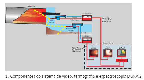 Os componentes do sistema de vídeo, termografia e espectroscopia da DURAG foram projetados para monitoramento e análise térmica do processo de produção de clínquer na zona de sinterização e para monitoramento da formação do leito de clínquer no resfriador de grelha (Fig.1). Os sistemas de sensores inteligentes industriais são purgados a ar e resfriados a água, painel de controle de campo para pré-processamento de dados de vídeo, termografia, espectroscopia e sinais de sensores, bem como o PLC de controle para supervisão de segurança dos sensores, um espectrômetro de dois canais, monitores de vídeo e o PC do sistema normalmente localizado na sala de controle do processo.